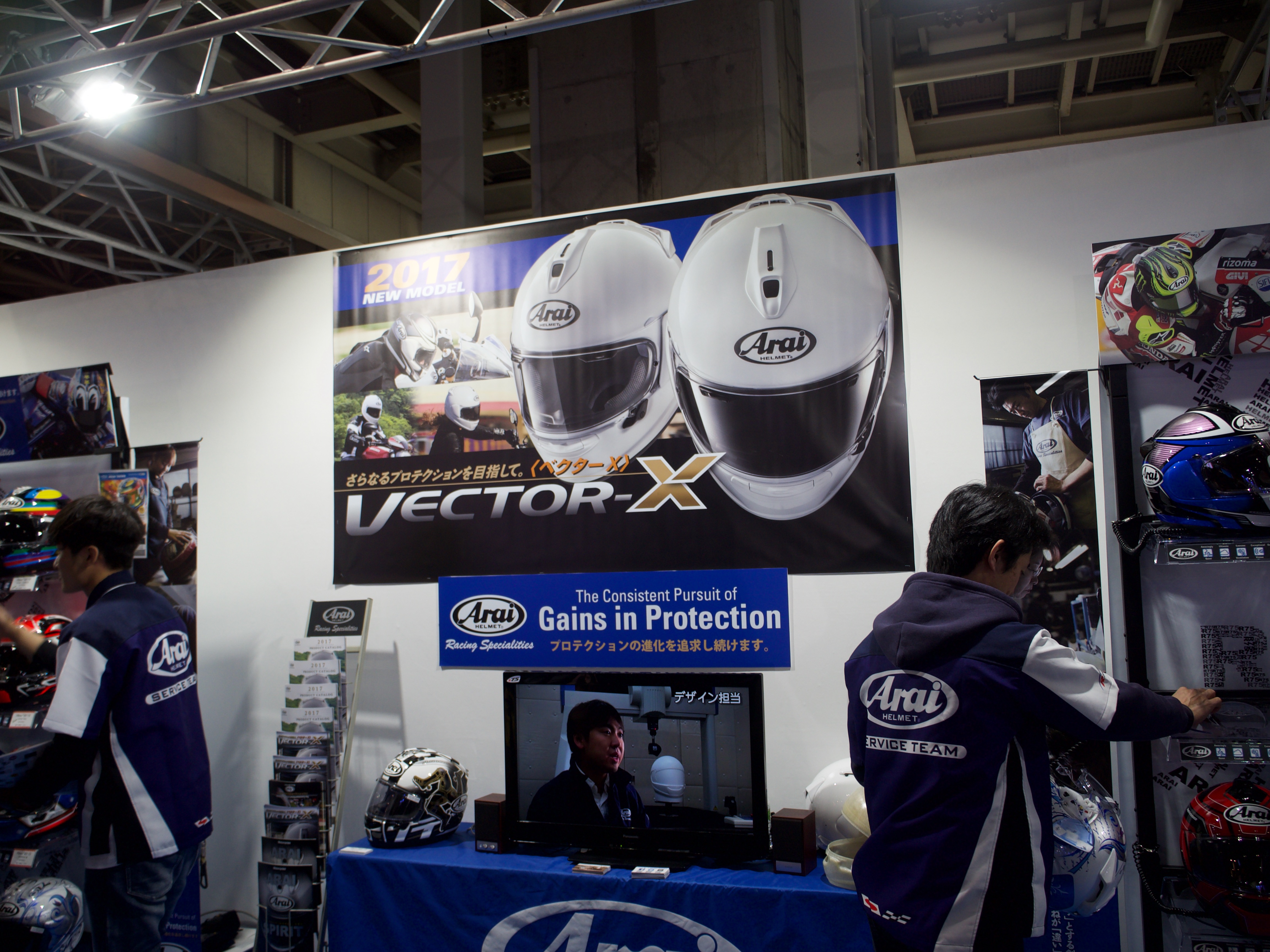 その裏の方にはヘルメットのアライのブース。当然、新作のVECTOR-Xを目立たせていた。