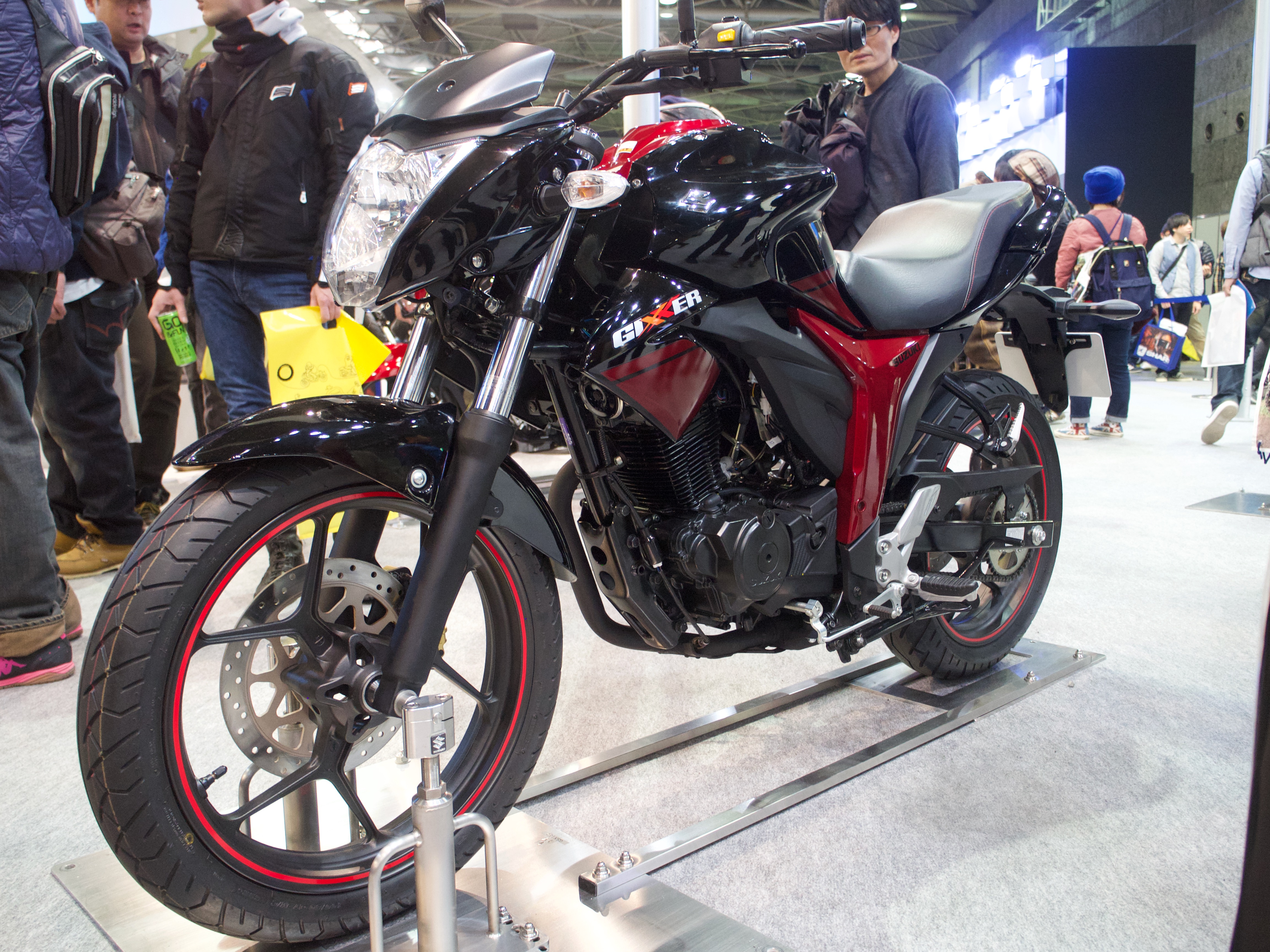 YAMAHAの隣はSUZUKI。実物を見たら、意外とかっこいい、GIXXER(ジクサー)。なんと150cc。でも高速道路もちゃんと走れるそうな。