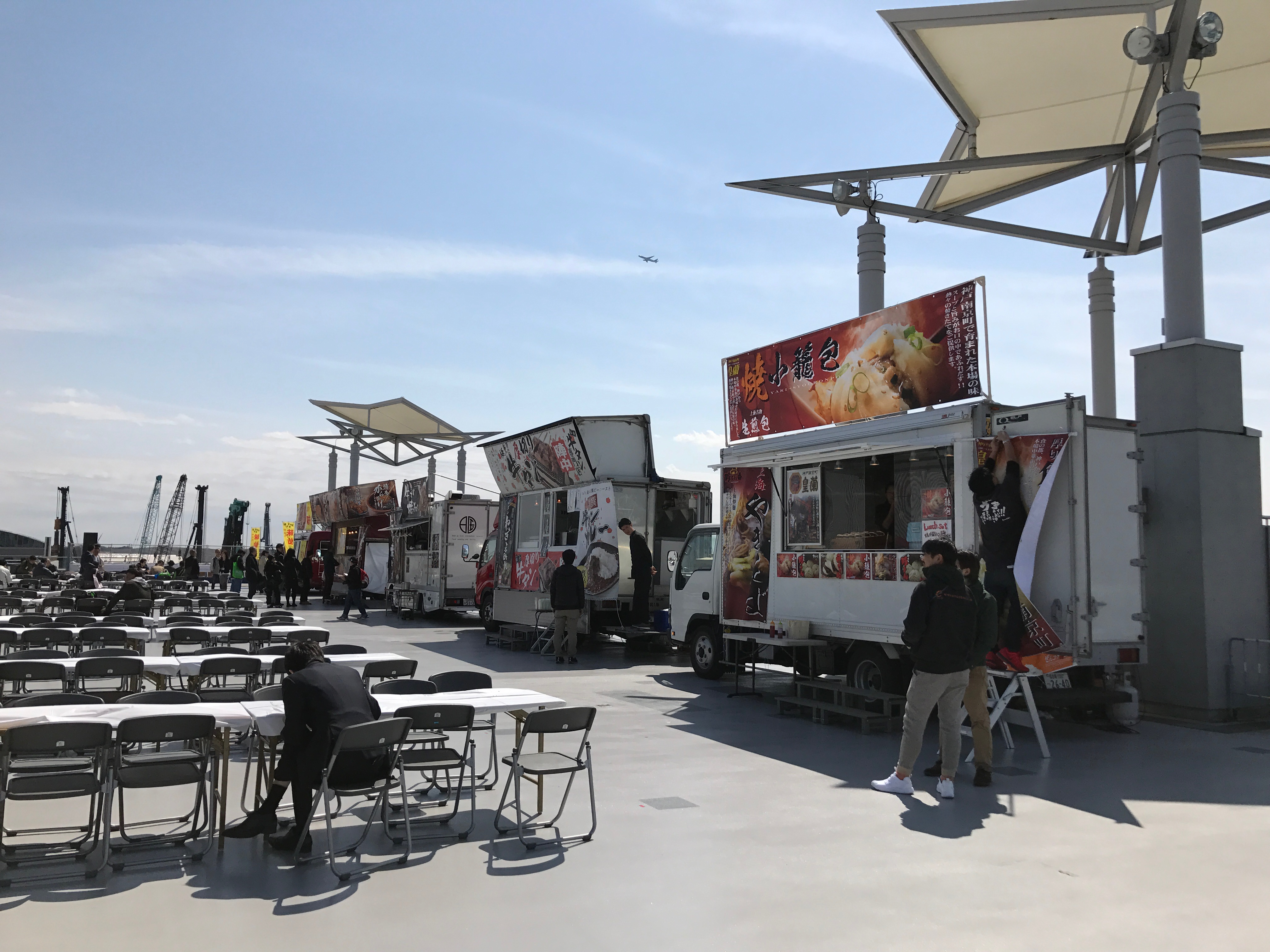 初日の24日に参加。寝坊やりんかい線の遅延などがあり、会場に着いたのは12時頃。出遅れた!と思ったら、初日の午前中はプレスなどの招待客だけで、一般客は13時からだった。まあ、結果オーライということで、4F屋外のフードコートをぶらぶら。屋台の数は大阪の倍くらいかな。