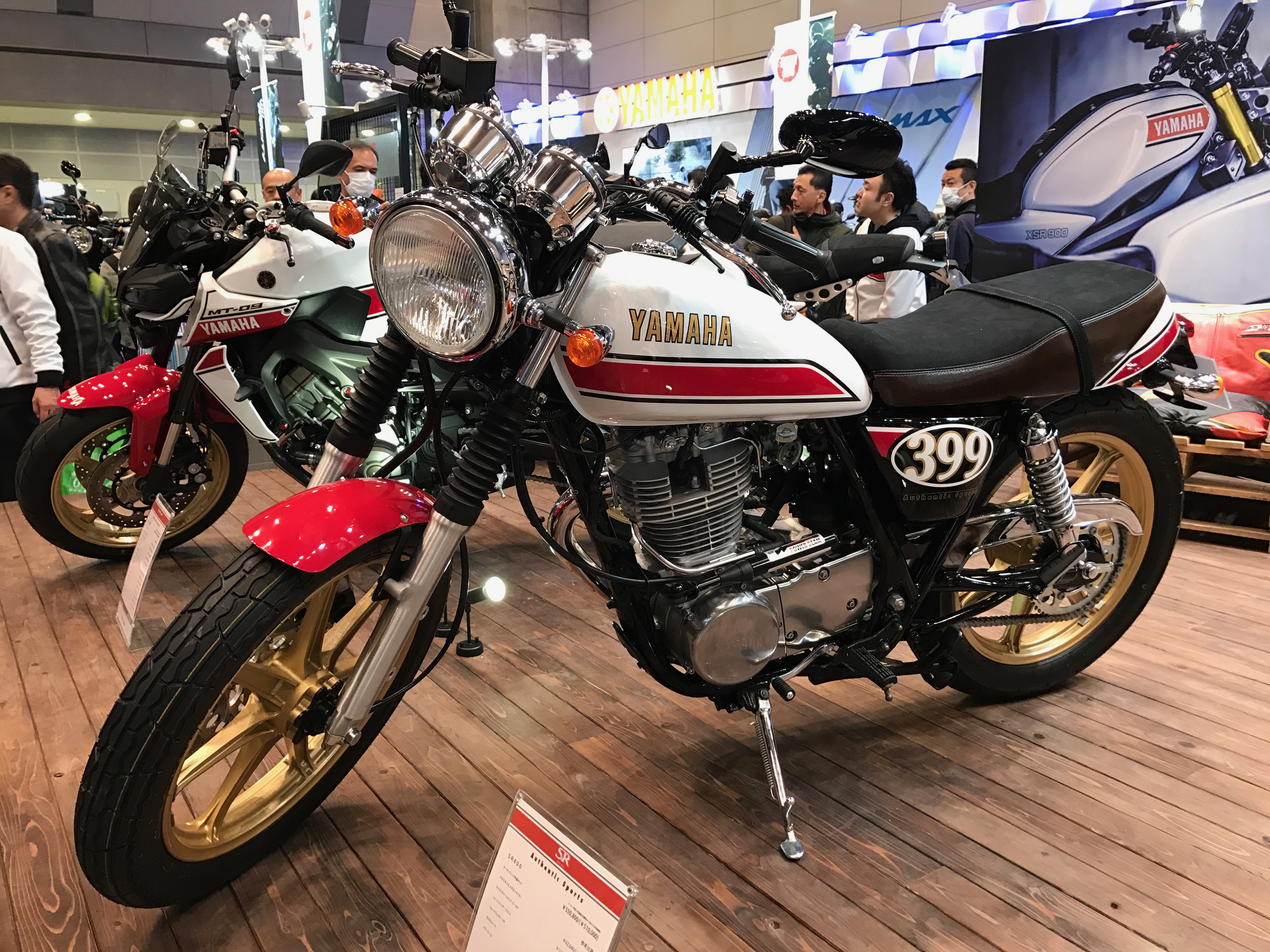 まず目を引いたのが、SR400のAuthentic Sports。これはヤマハ純正のオーセンティック外装セットを装着したSR400。SRはデフォルトでも十二分にかっこいいが、これはやばすぎるだろう。