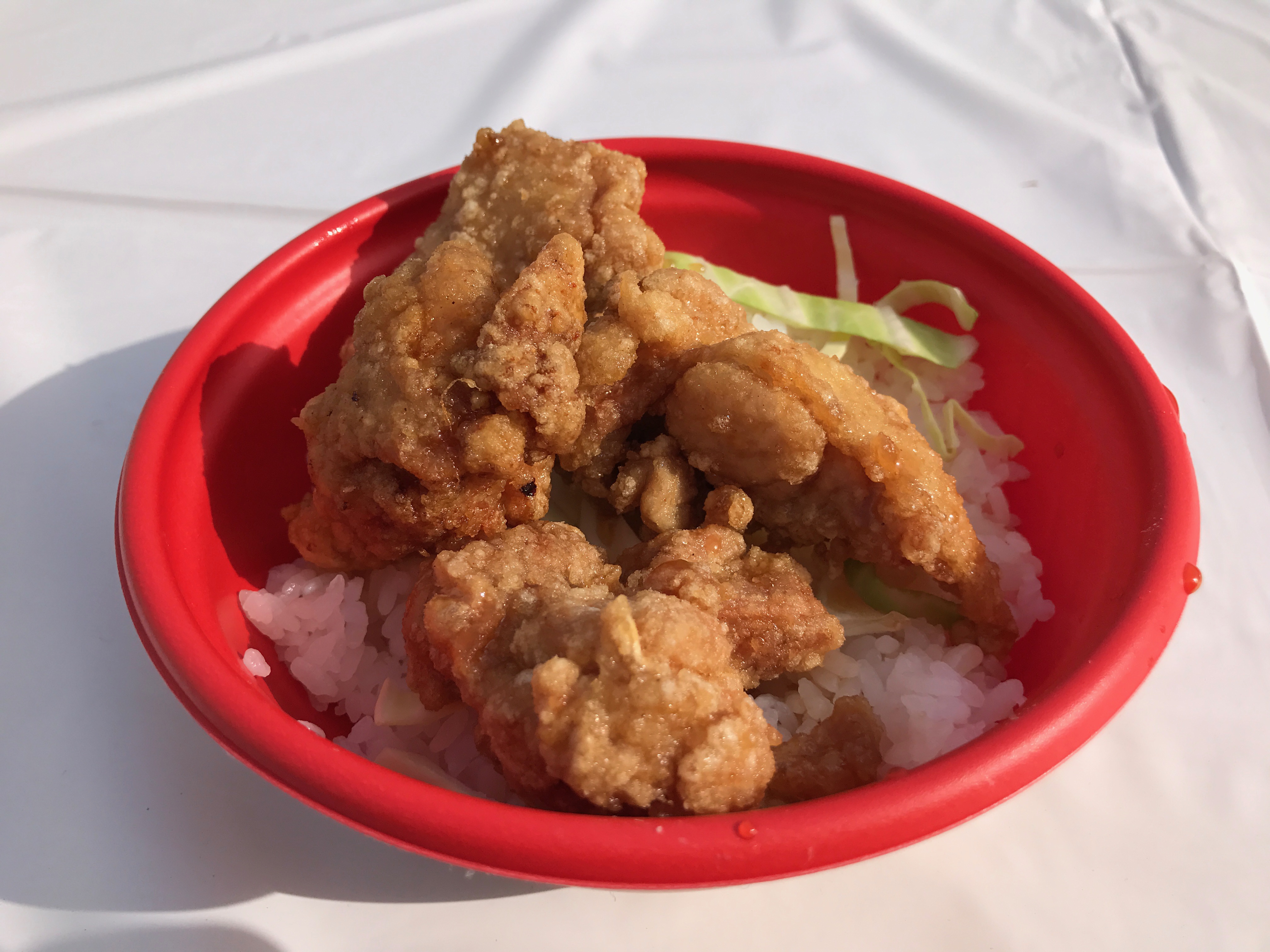 博多からあげの唐揚げ丼、800円。唐揚げは美味しいが、ご飯が冷めていて残念。