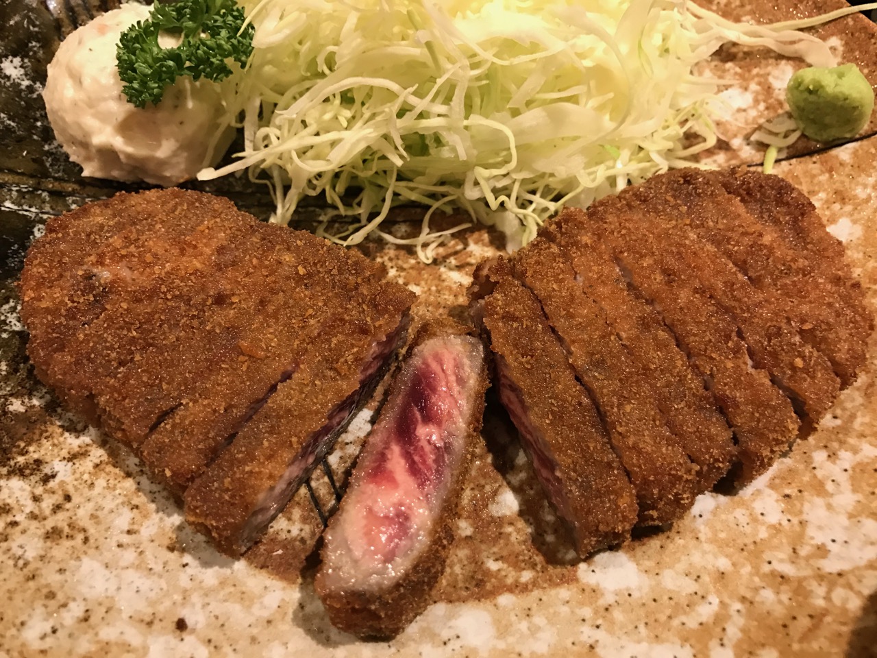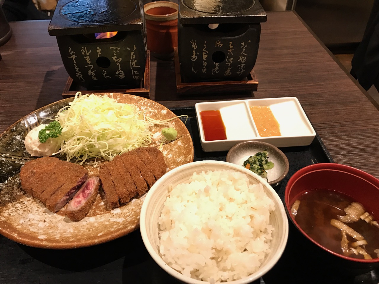 表面はカラッと揚がっているが、中身はレア。わさび醤油が合う。ここまではおか田と同じだが、ここからが異なる。まず、ご飯は麦飯。残念ながら、ちょっとかたい。そして、焼き石で、自分の好みでかつを焼く。これはグッドアイデアだ。いろんな焼き具合を楽しめる。肉は申し分なく美味しい。おか田に比べると、脂身が少し多い気がするが、これはこれでいい。