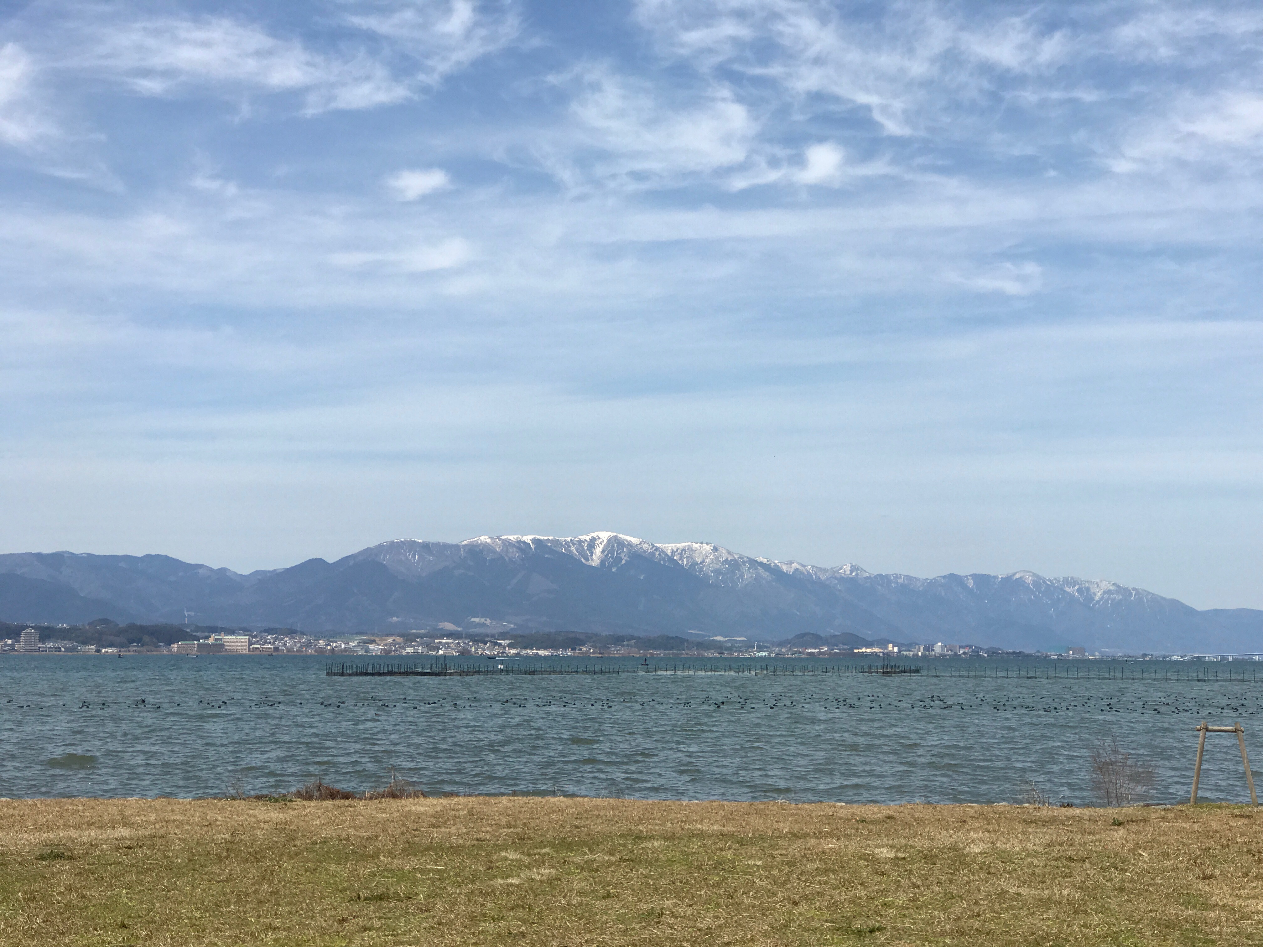 琵琶湖東側の湖岸道路はさざなみ街道と言い、適度なカーブが続く、舗装状態の良い道路。琵琶湖を横目に気持ちよく走ることができる。遠くには雪山が見える。