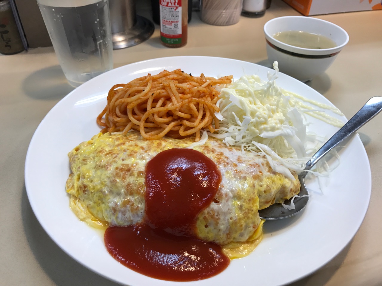 ちなみにオムライスに付け添えられているナポリタンは少しぱさぱさで、お弁当に入っているおかずのような感じ。メニューにはナポリタン単品もあり、きっと残念な味、と思いがちだが、実はこっちはジューシーでおすすめ。