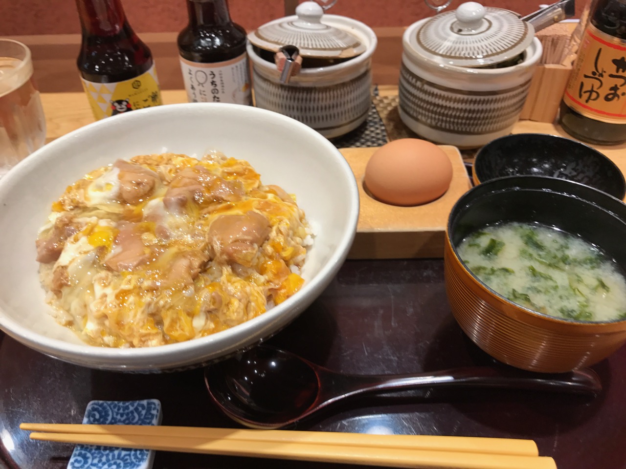 メニューはたまごかけごはん、親子丼、たまご丼の3種類だけ。昼食を取る時間がなく、この時間になってしまい、メチャクチャ腹が減っているので、親子丼。でも、オススメはやっぱりたまごかけごはんだけどね。なお、味噌汁はつかないので、別注文のあおさの味噌汁は必須。