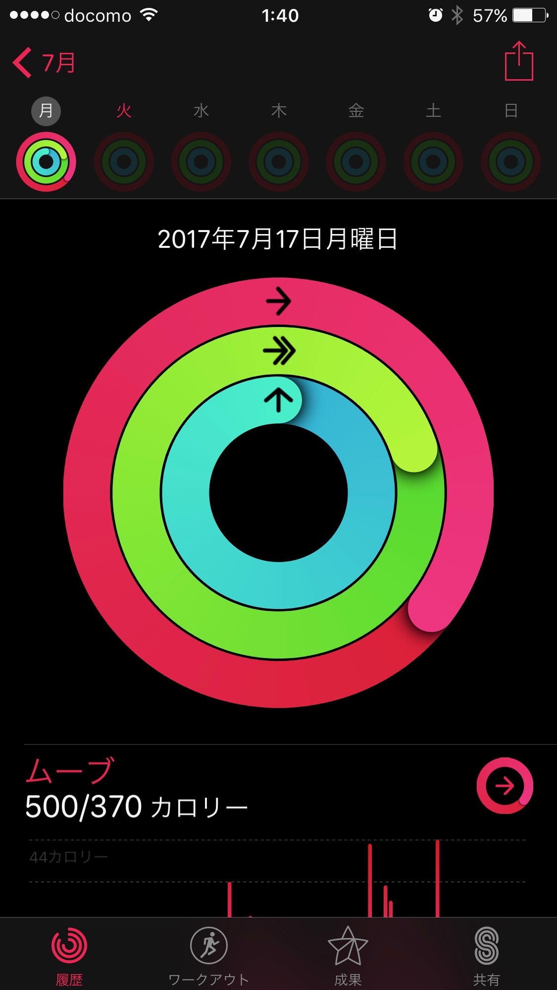 アクティビティが計測する活動量はムーブ、エクササイズ、スタンドの3種類。ムーブは消費したカロリー、エクササイズは早歩き以上の運動をした合計時間、スタンドは1分以上立ち上がっていた時間数で、それぞれ毎日集計される。スタンドが分かりにくいと思うが、要するに1時間に1回くらいは1分以上立ち上がりなさいってことで、立ち上がれた時間数がカウントされ、12回(12時間)を超えるとokになる。3種類のアクティビティの達成度は、下の写真のように円グラフで表現される。写真はiPhoneの画面だが、Apple Watchでも同様に表示される。というか、この円グラフはApple Watchに最適化されたデザインであろう。外側の赤色系がムーブ、中間の緑色系がエクササイズ、内側の青色系がスタンドを表している。一周すると目標値をクリアしたことになる。直感的に分かりやすく、なかなか良いデザインだが、個人的には赤色系の後半の色合いはイマイチかな。(それぞれのアクティビティに関するAppleの説明はこちら。)