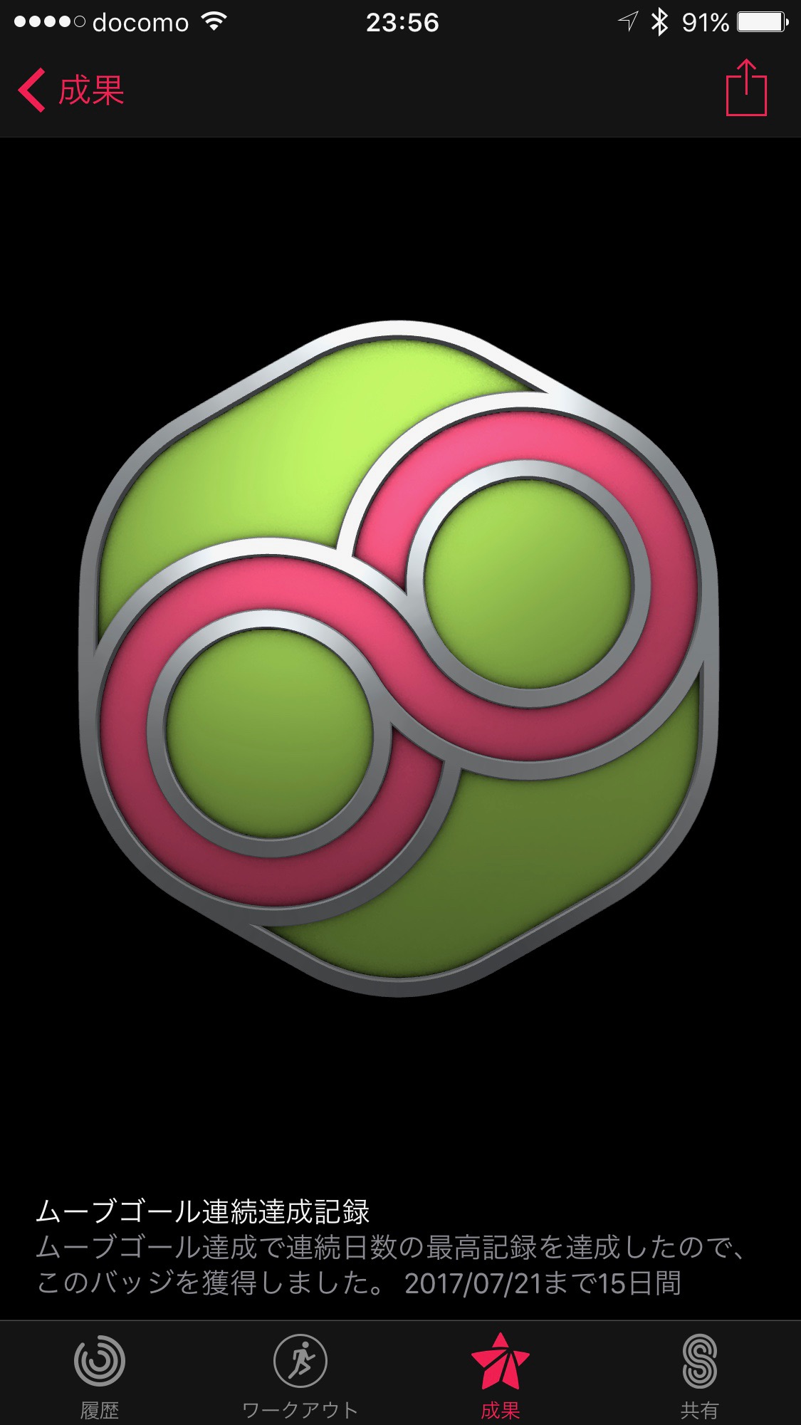 なるほど、ムーブゴールを更新し続けている間は毎日バッジが貰えるってことか。まあ、同じバッジなので、そんなにありがたみはないが。