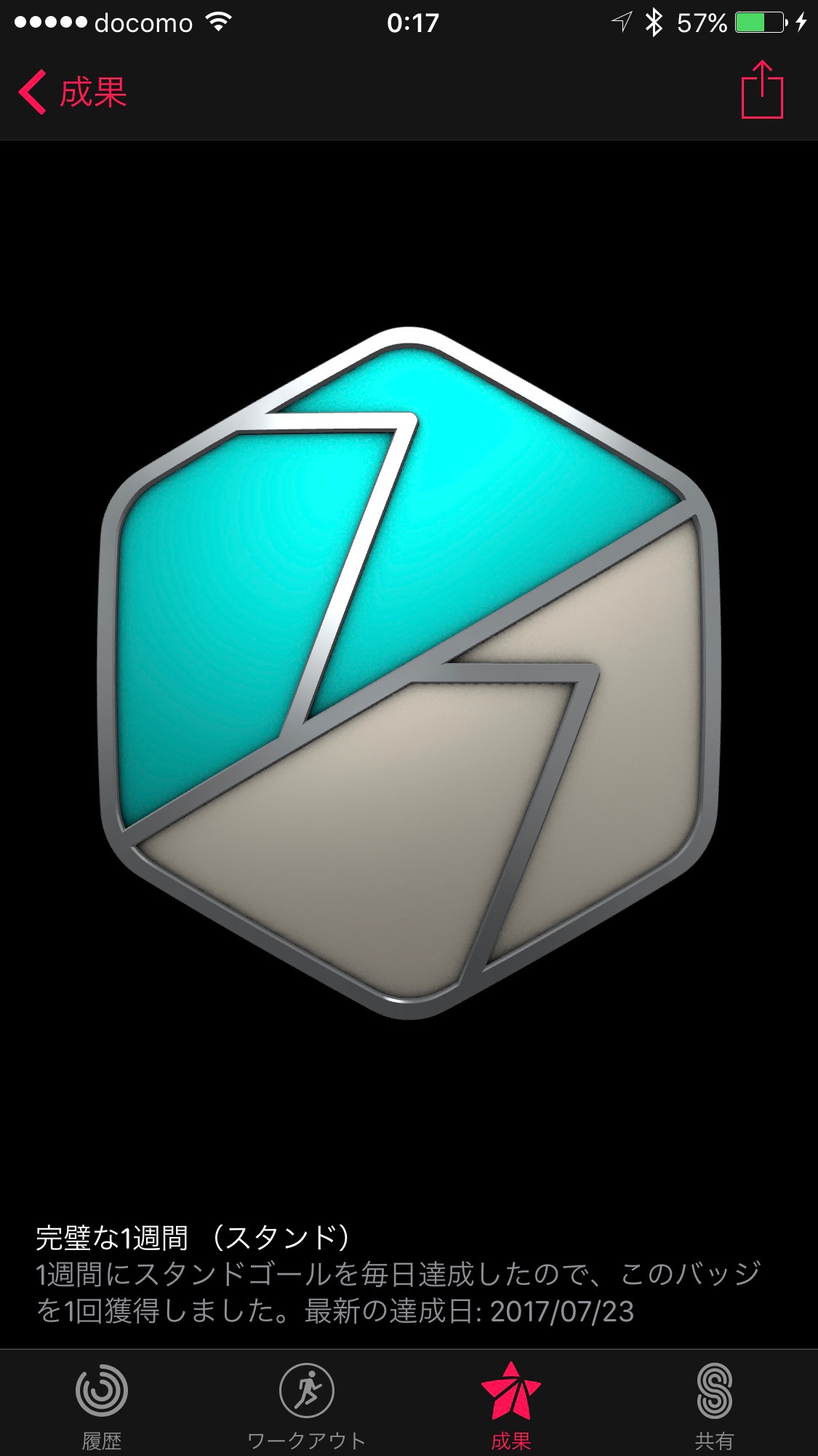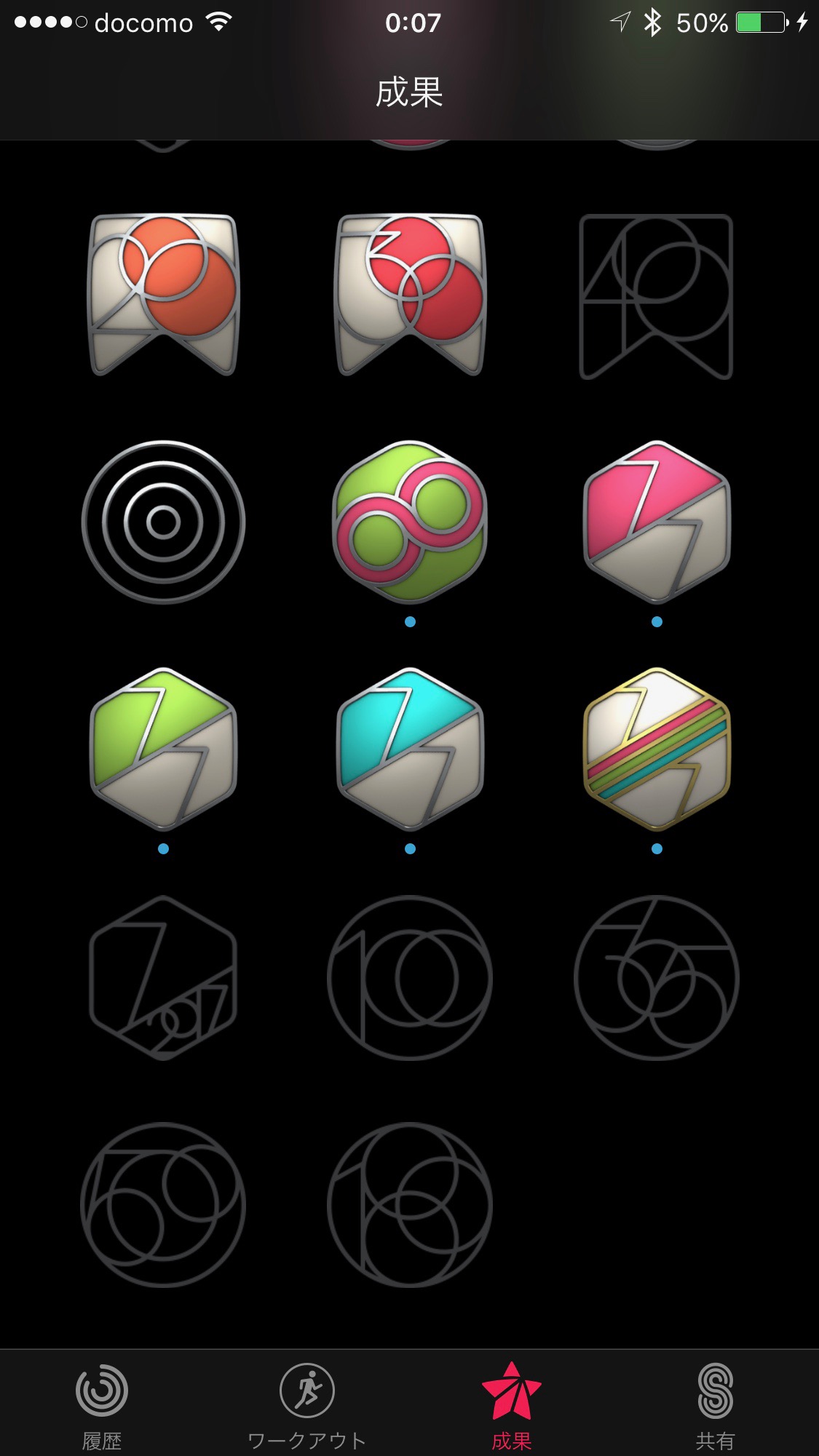 「完璧な1週間(スタンド)」の達成を目指して、今週は頑張ってきた。その結果、それ以外のバッジも大量に獲得してしまった! その数、なんと6個!! 下の写真で、青色の小さい丸が付いているバッジがそれら。