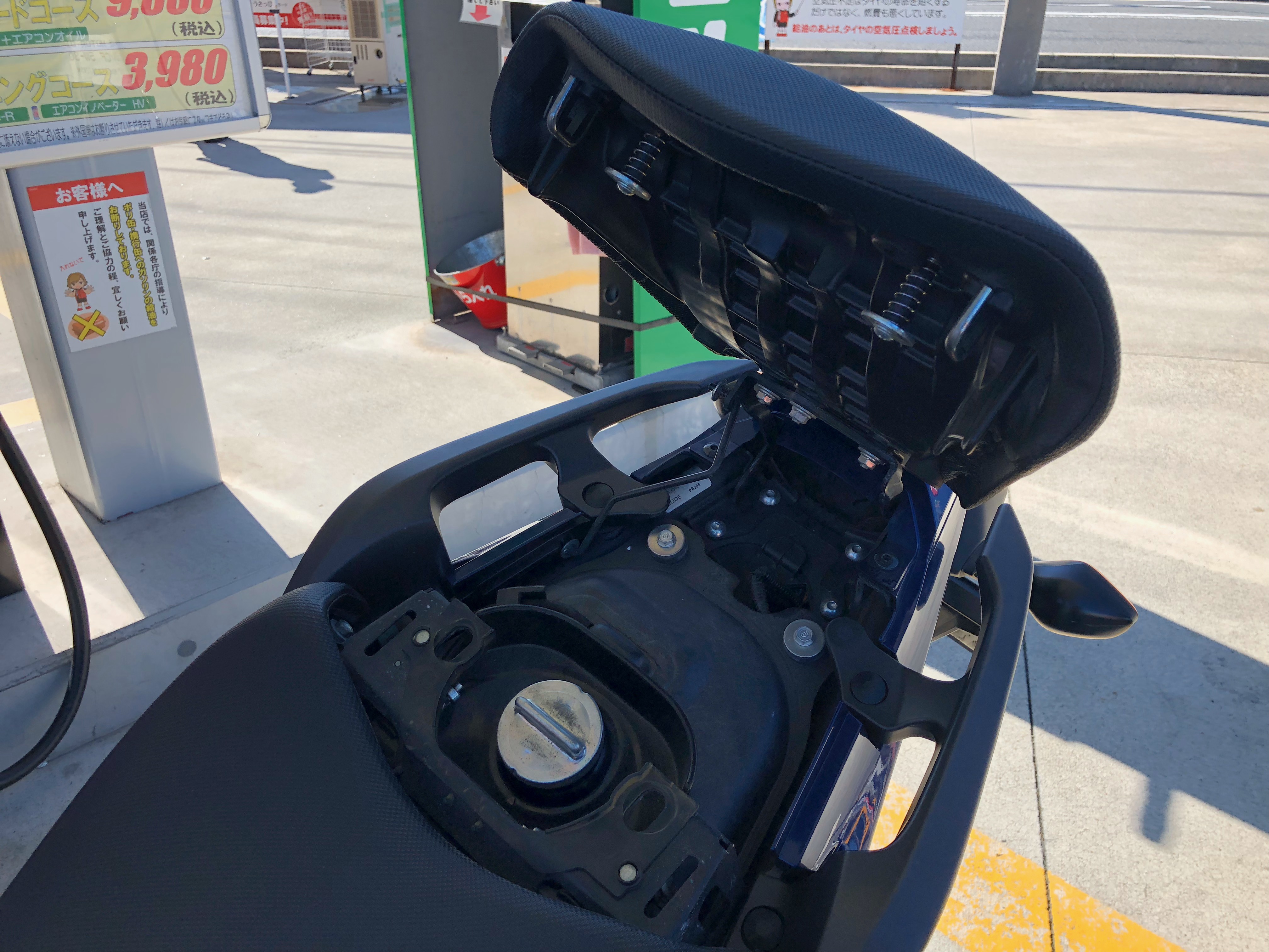 では、燃料タンクはどこに? シート下にあるので、後部シートを開けて給油する。