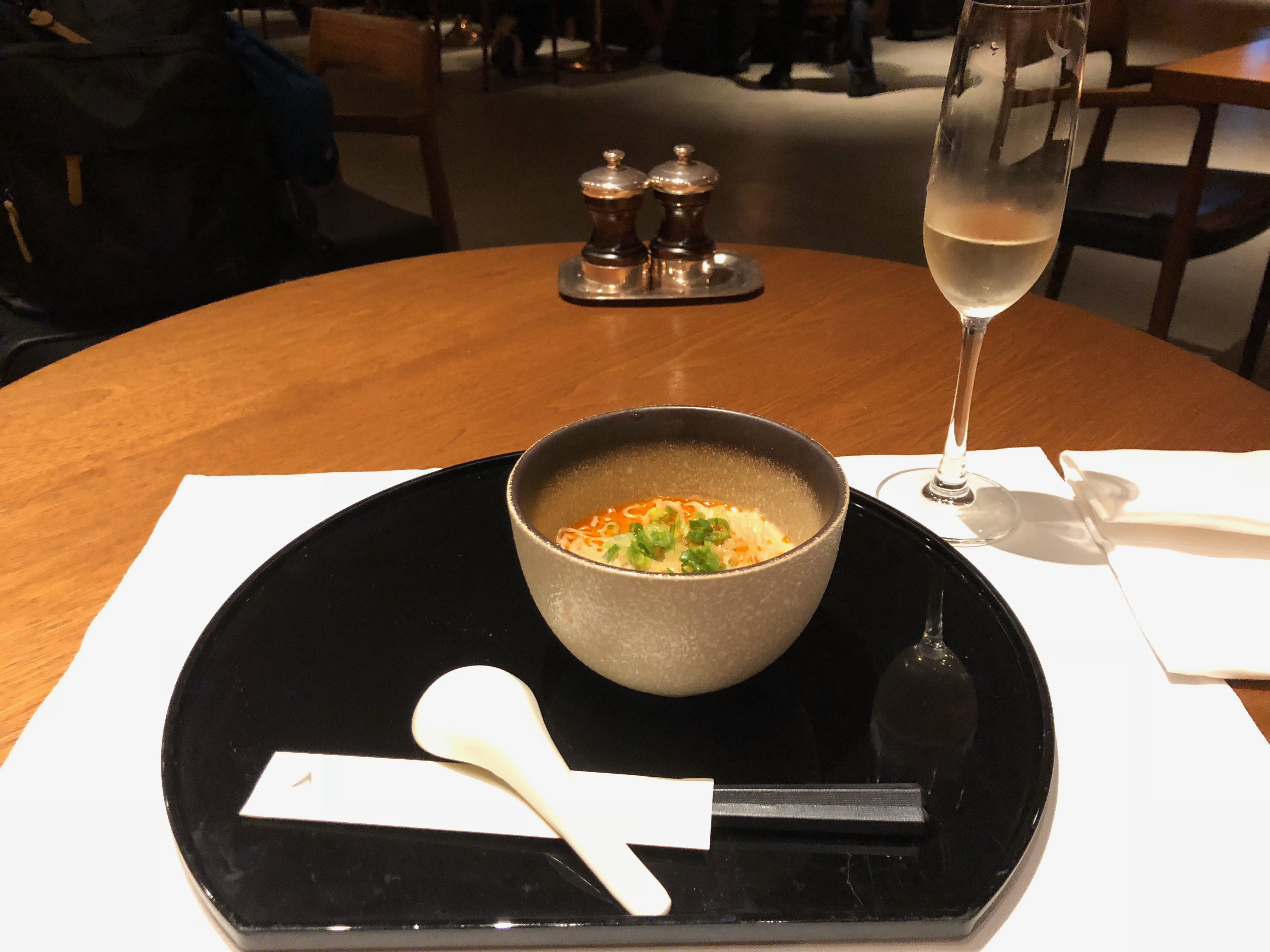 次の便まで2時間弱あるので、ラウンジで一休み。もう深夜なので飲み物だけにしようと思ったが・・・結局、食べる。坦々麺のようなヌードル。