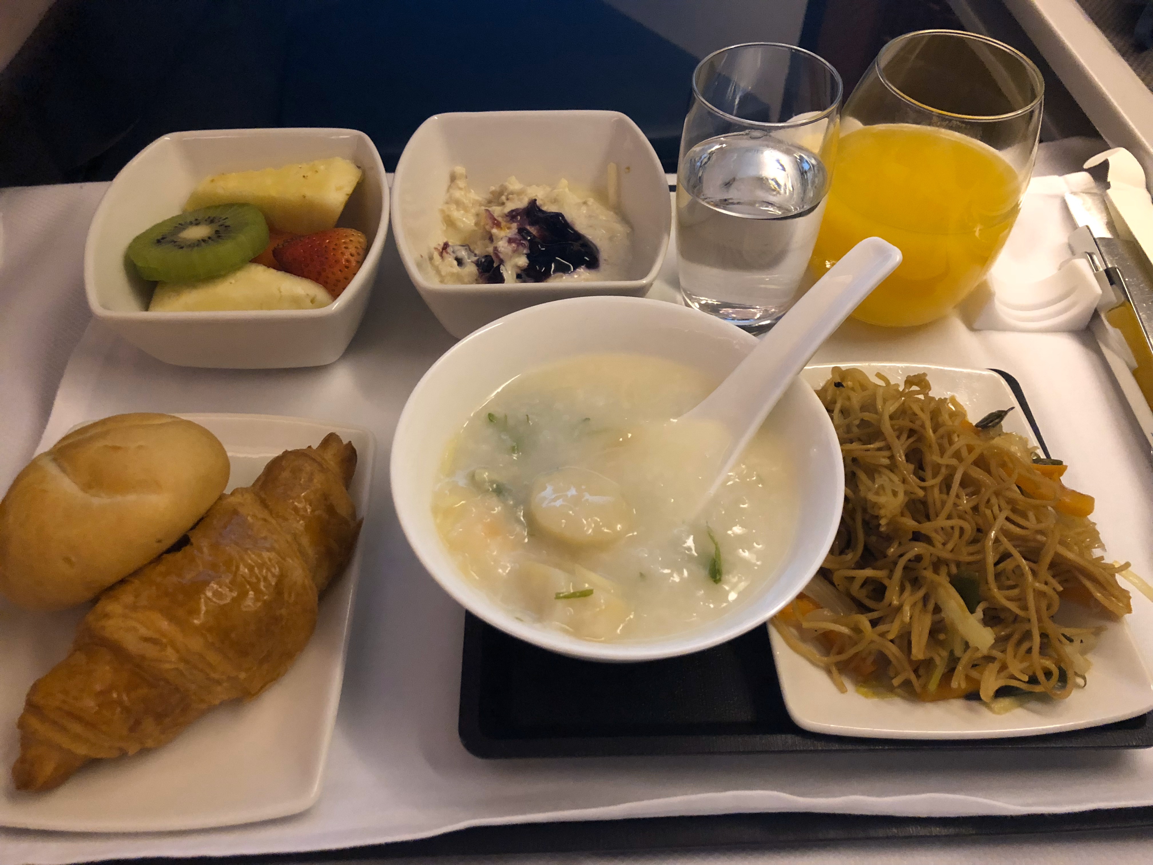 ローマから約11時間のフライトで、香港国際空港に到着。早朝だが、朝食はガッツリといただく。