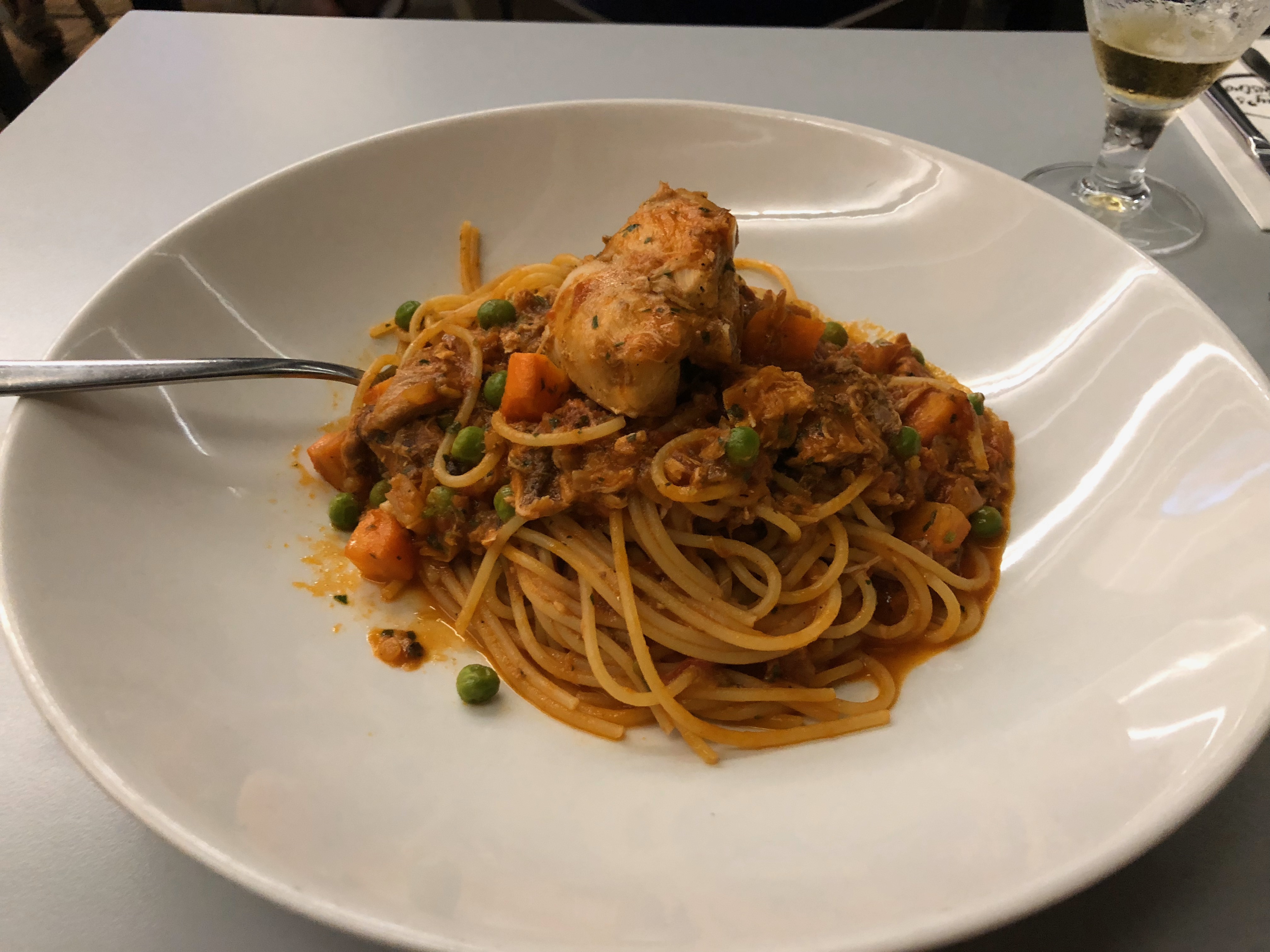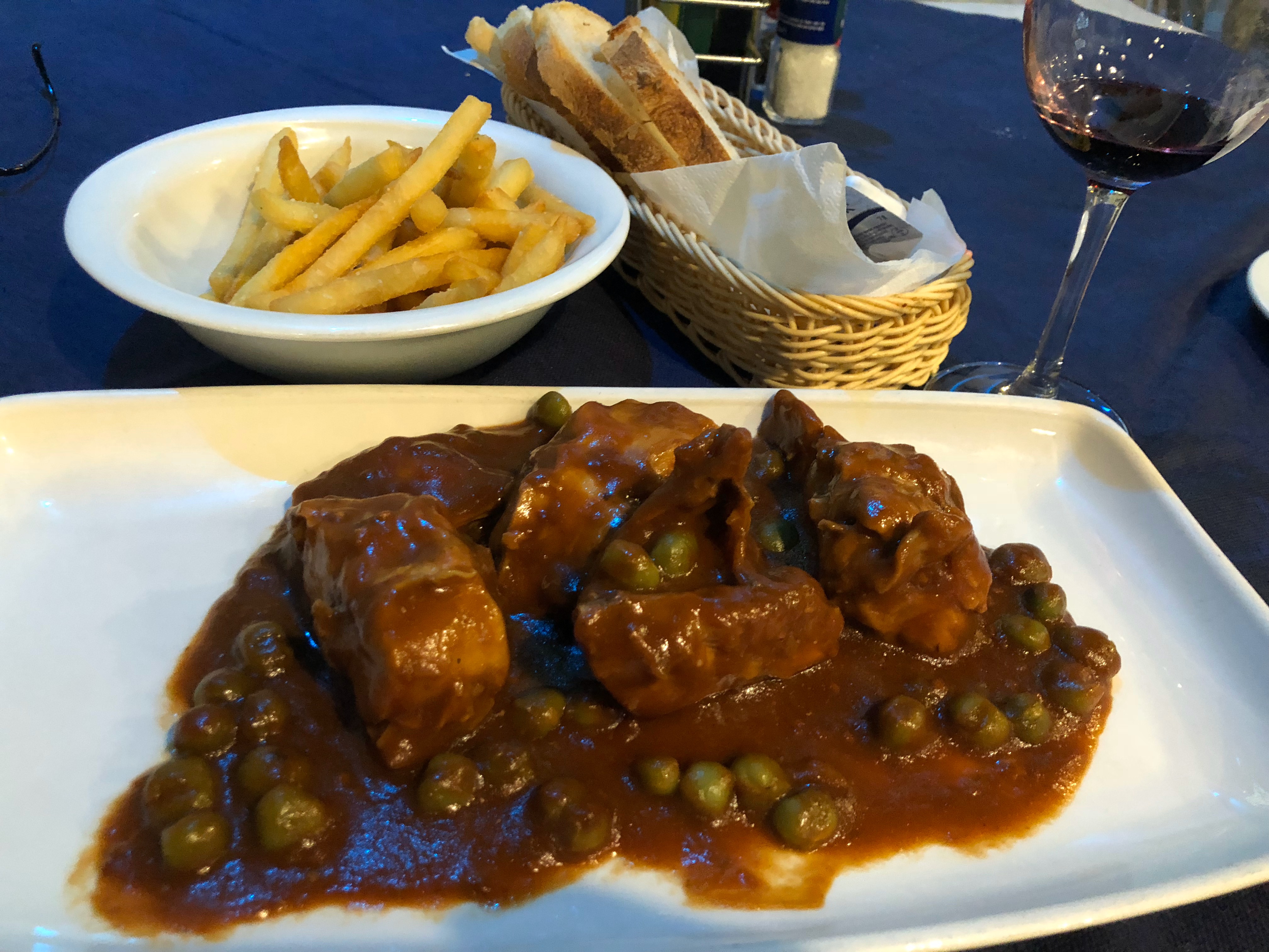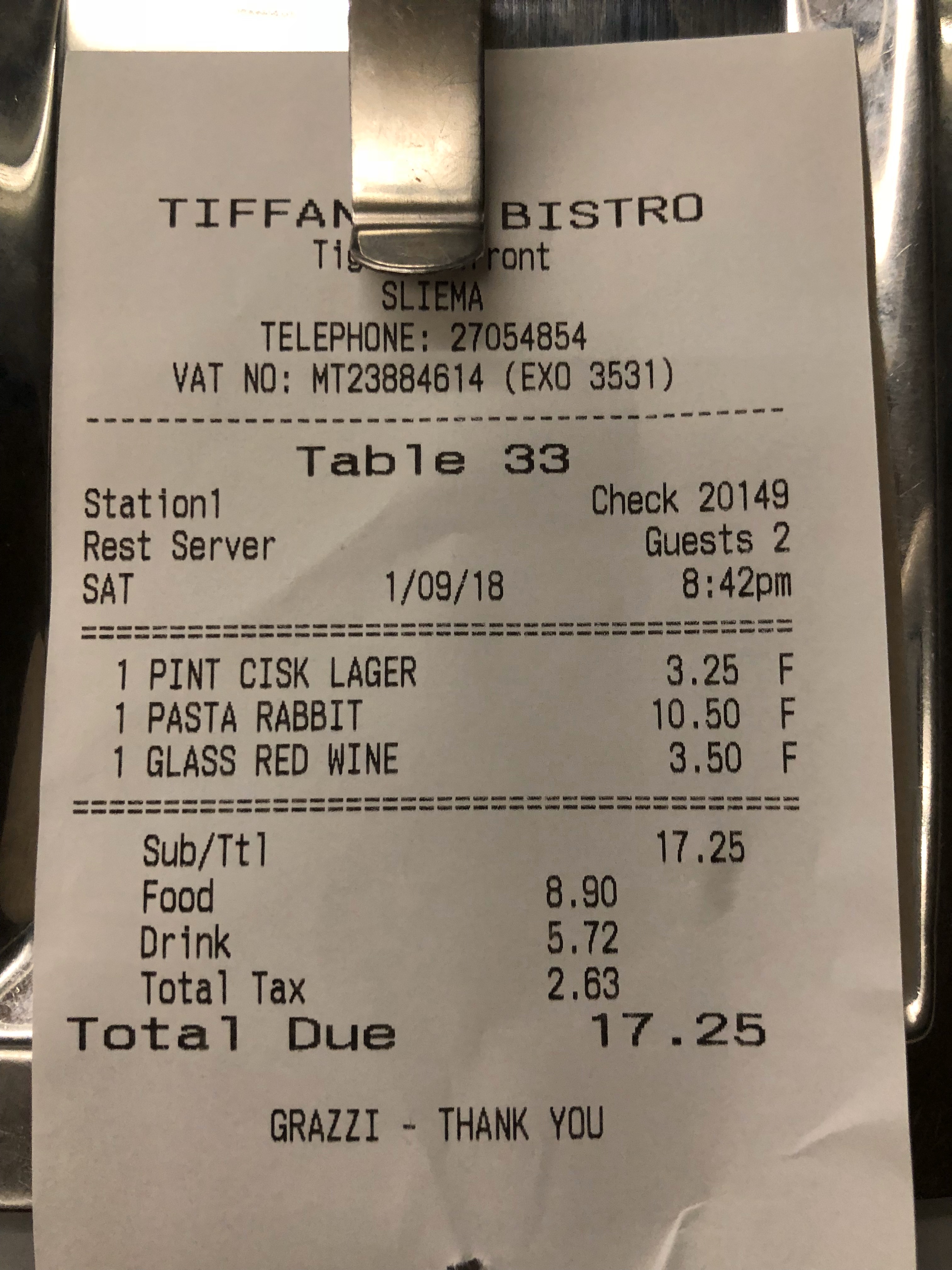 夕食は港付近のイタリアンレストラン、Tiffany’s Bistro。ビールとウサギのパスタ、そして赤ワインを注文。しめて17.25ユーロ。