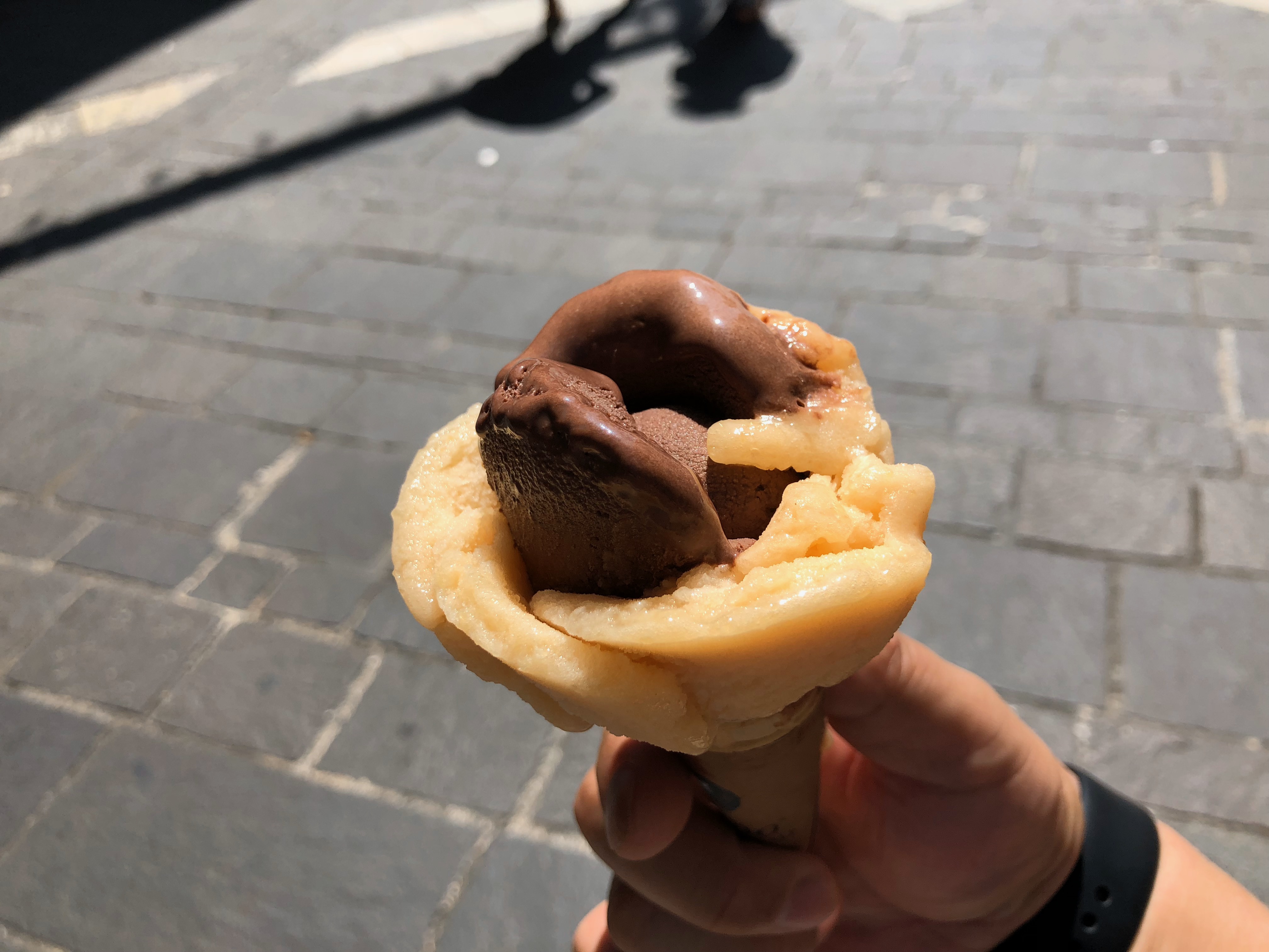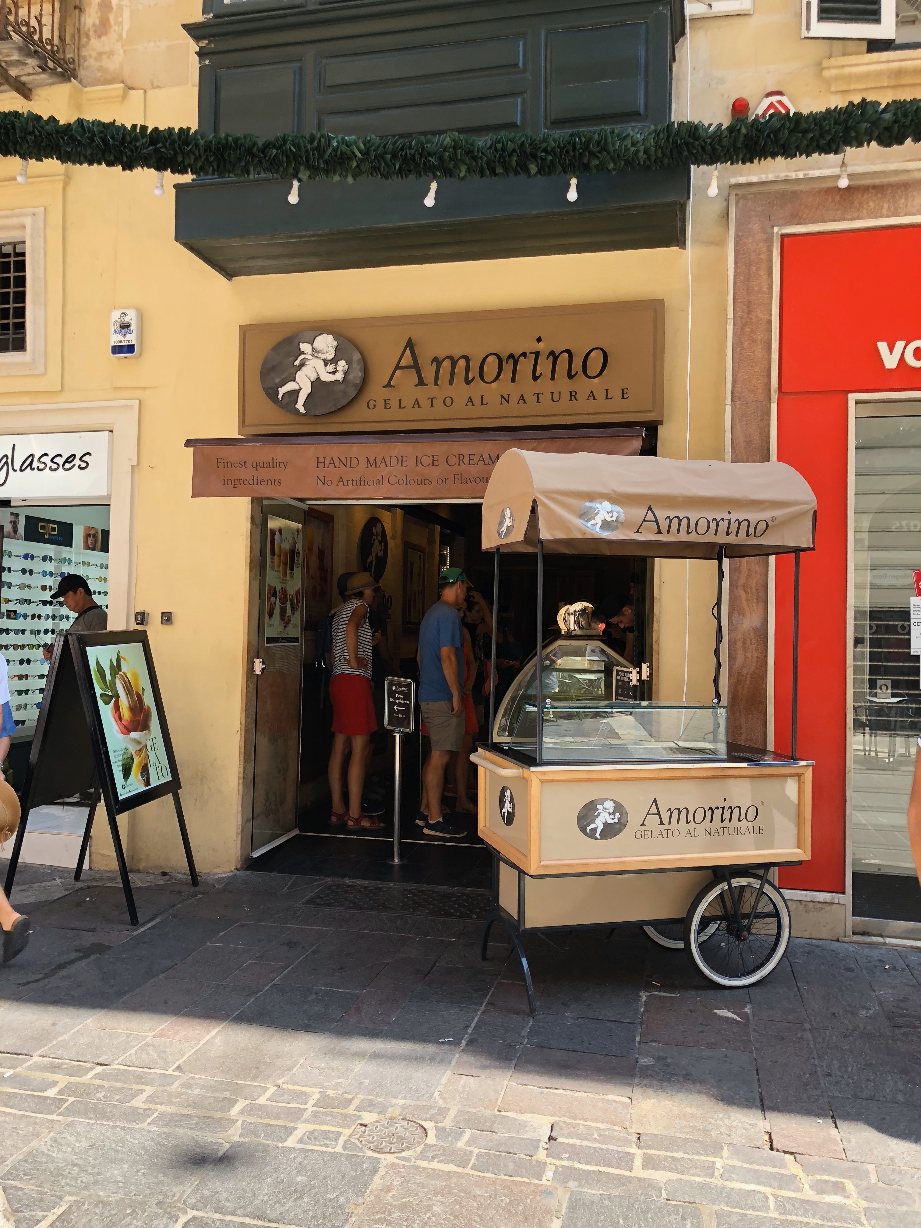 ランチはLa Sfogliaというイタリアンレストランで、白ワインとパスタ。そして、暑いので、デザートに近くのジェラート屋さんAmorinoでテイクアウト。